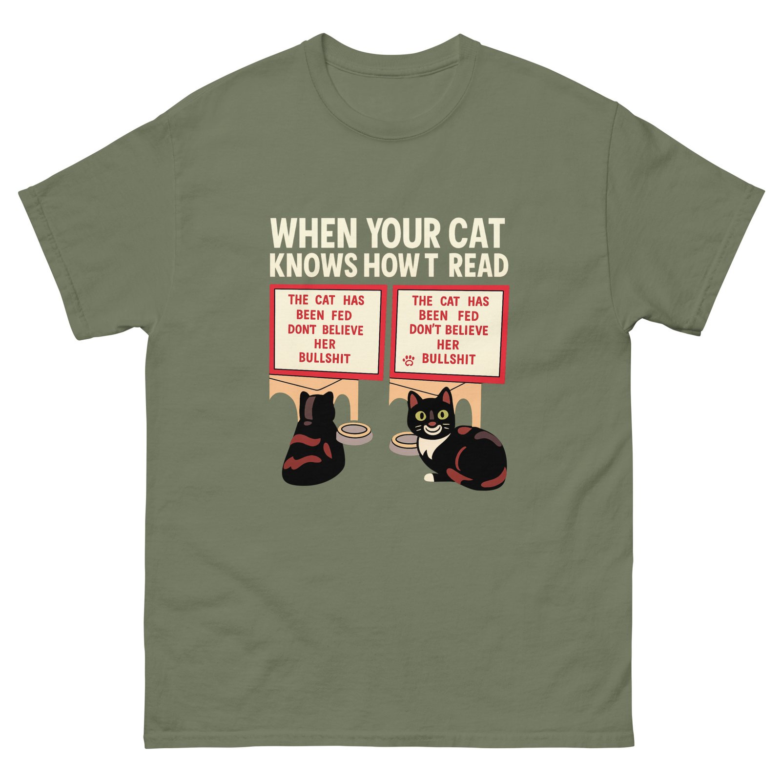 Cat Can Read Kitchen Sign – The Cat Has Been Fed, Don’t Believe Her Funny Pet Feeding Meme Tee – Unisex classic tee