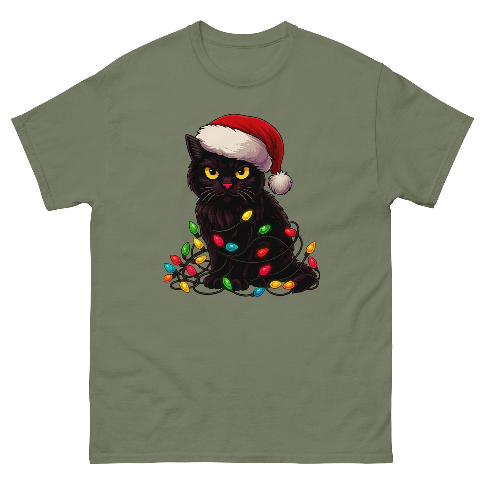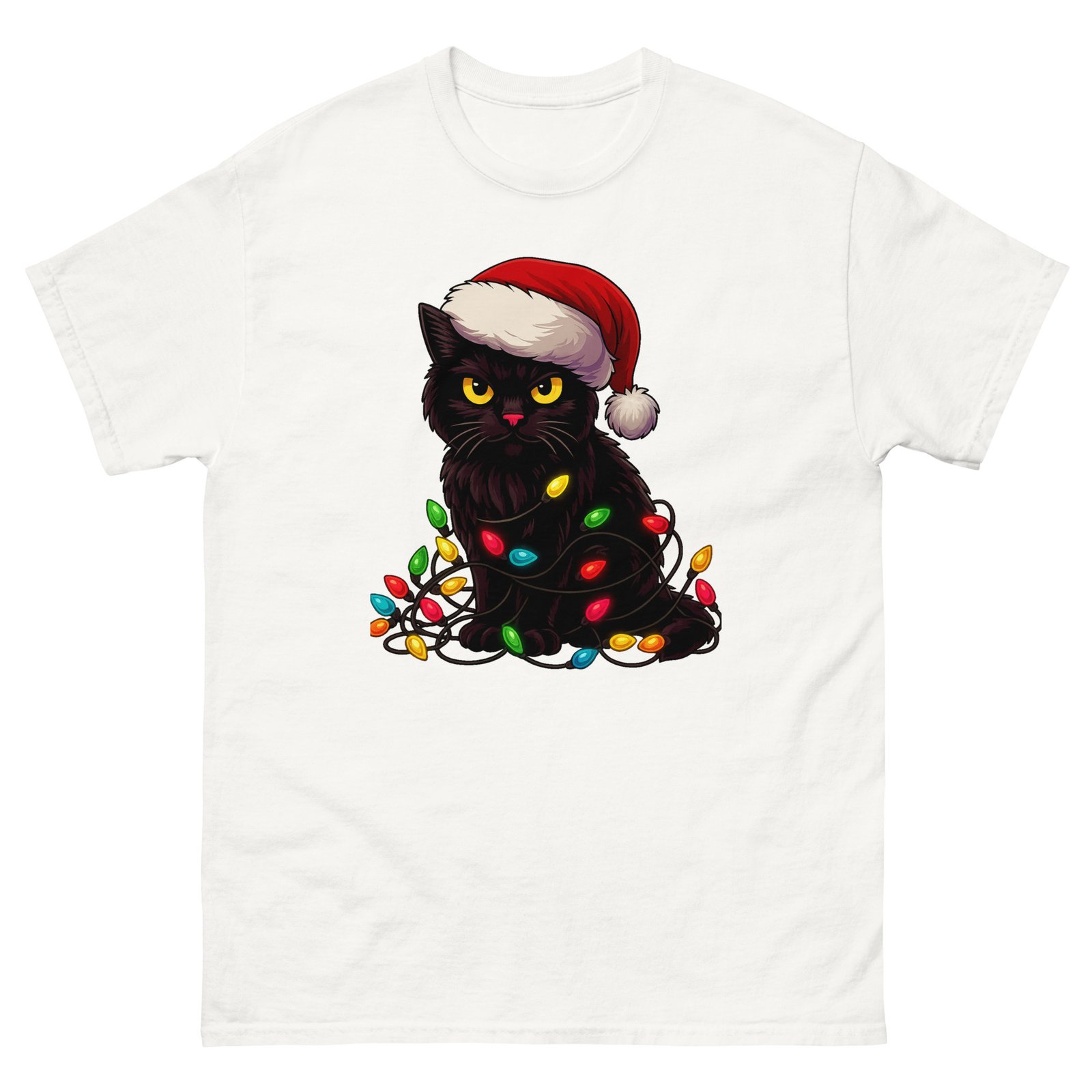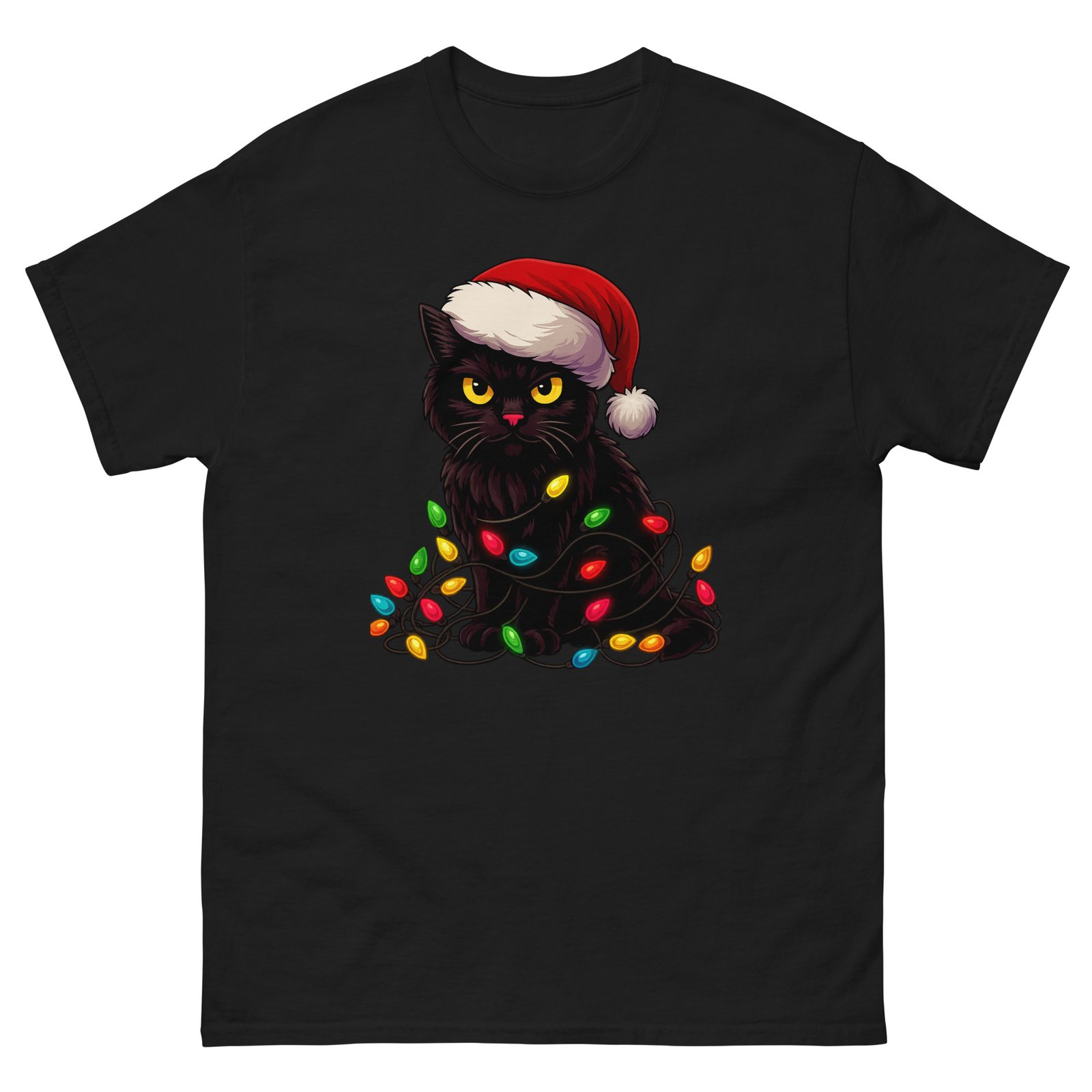 Christmas Black Cat – Santa Hat Cat with Holiday Lights Graphic Tee – Unisex classic tee