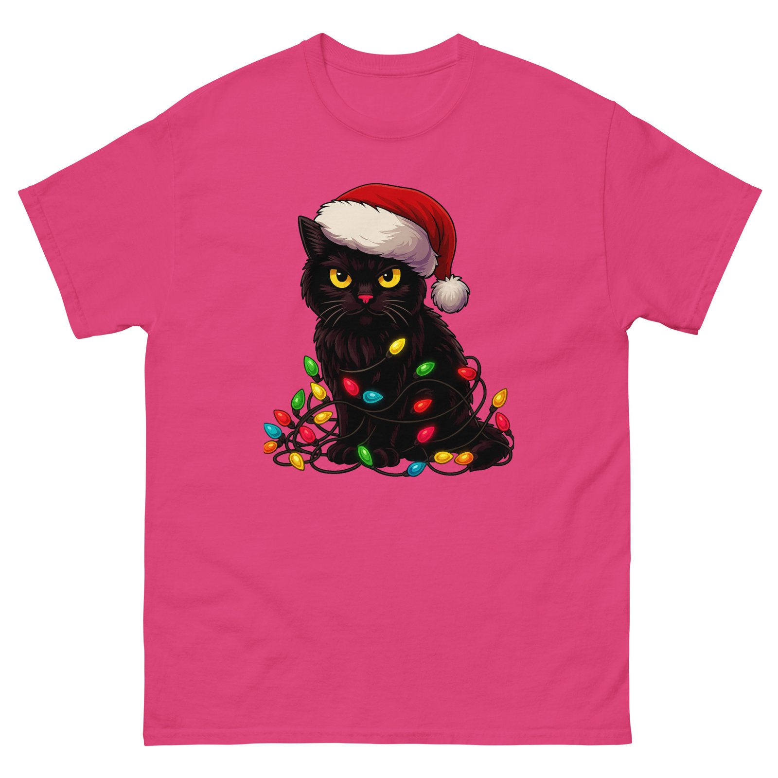 Christmas Black Cat – Santa Hat Cat with Holiday Lights Graphic Tee – Unisex classic tee