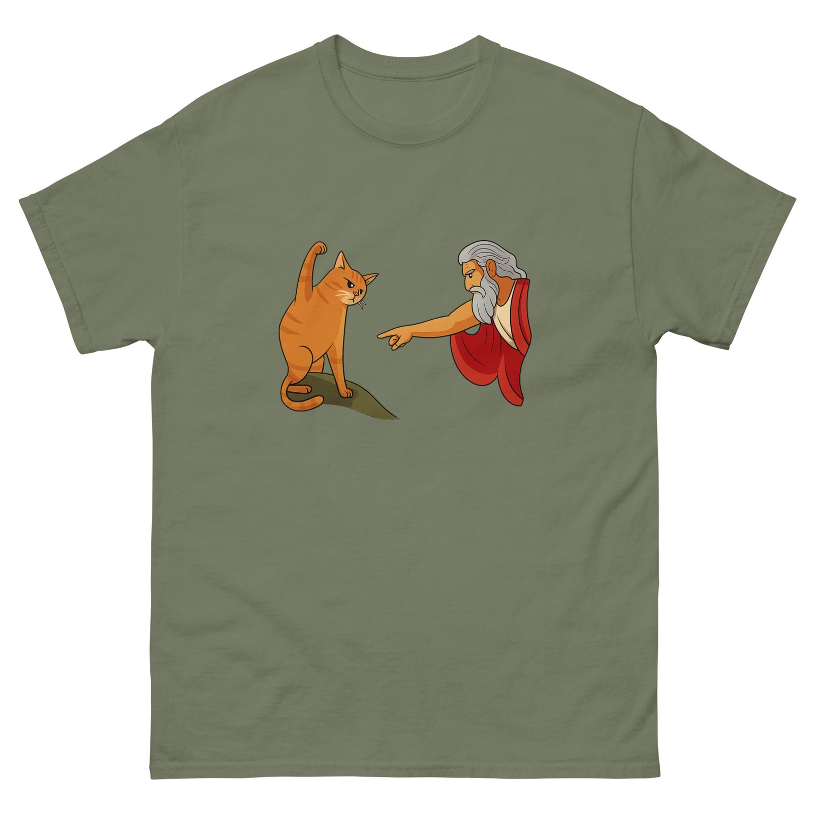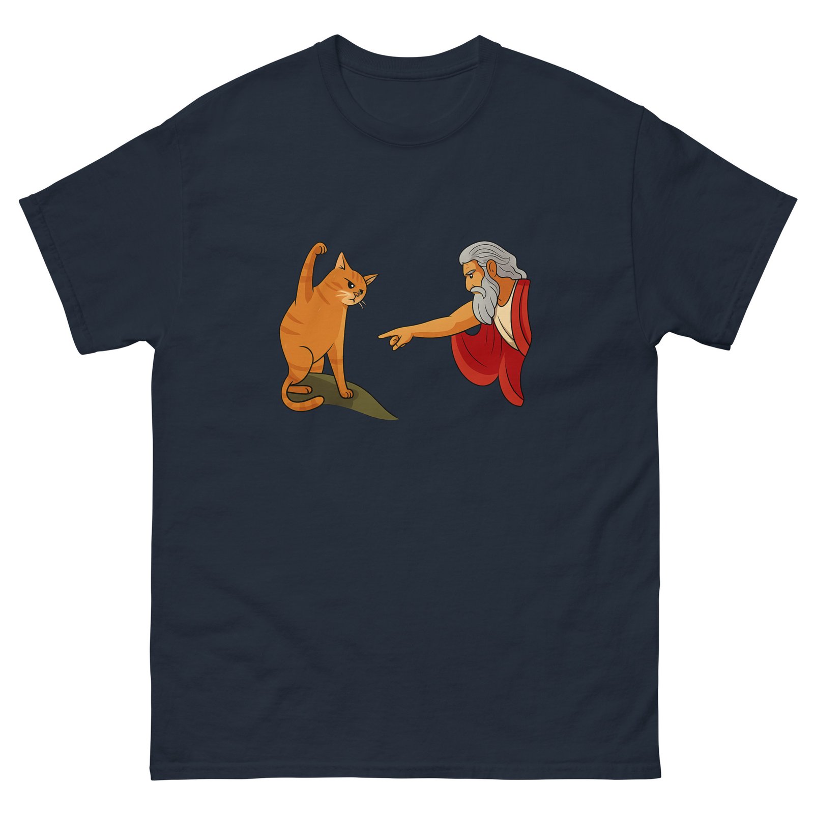 Be the first to review “God and Cat Meme – Funny Orange Cat Reaching for God Graphic Tee – Unisex classic tee”