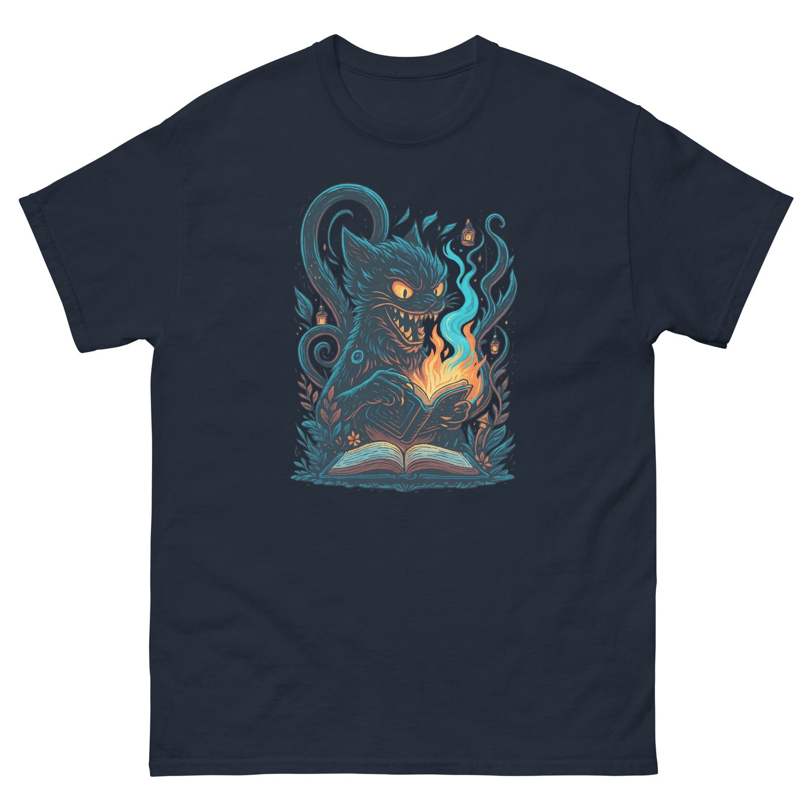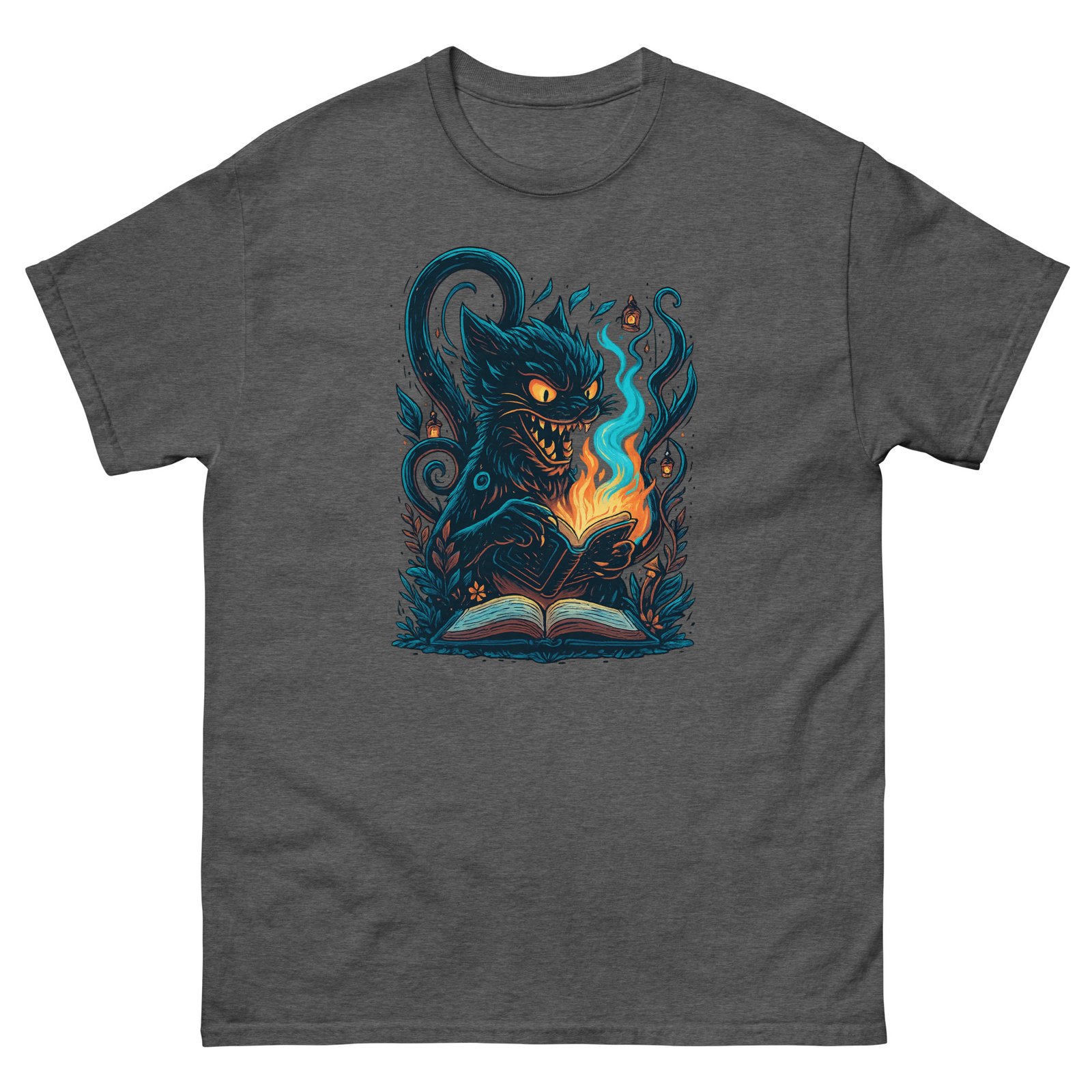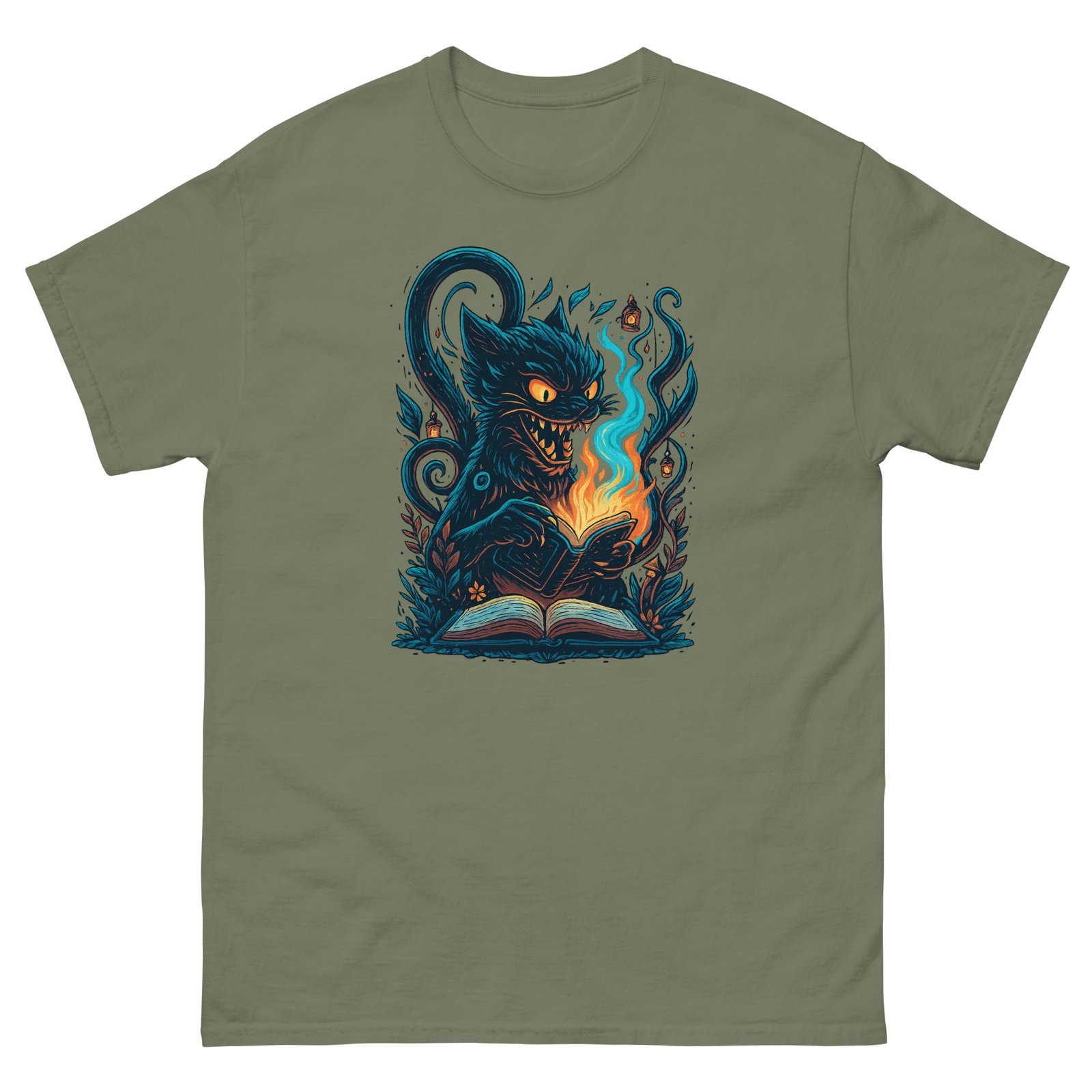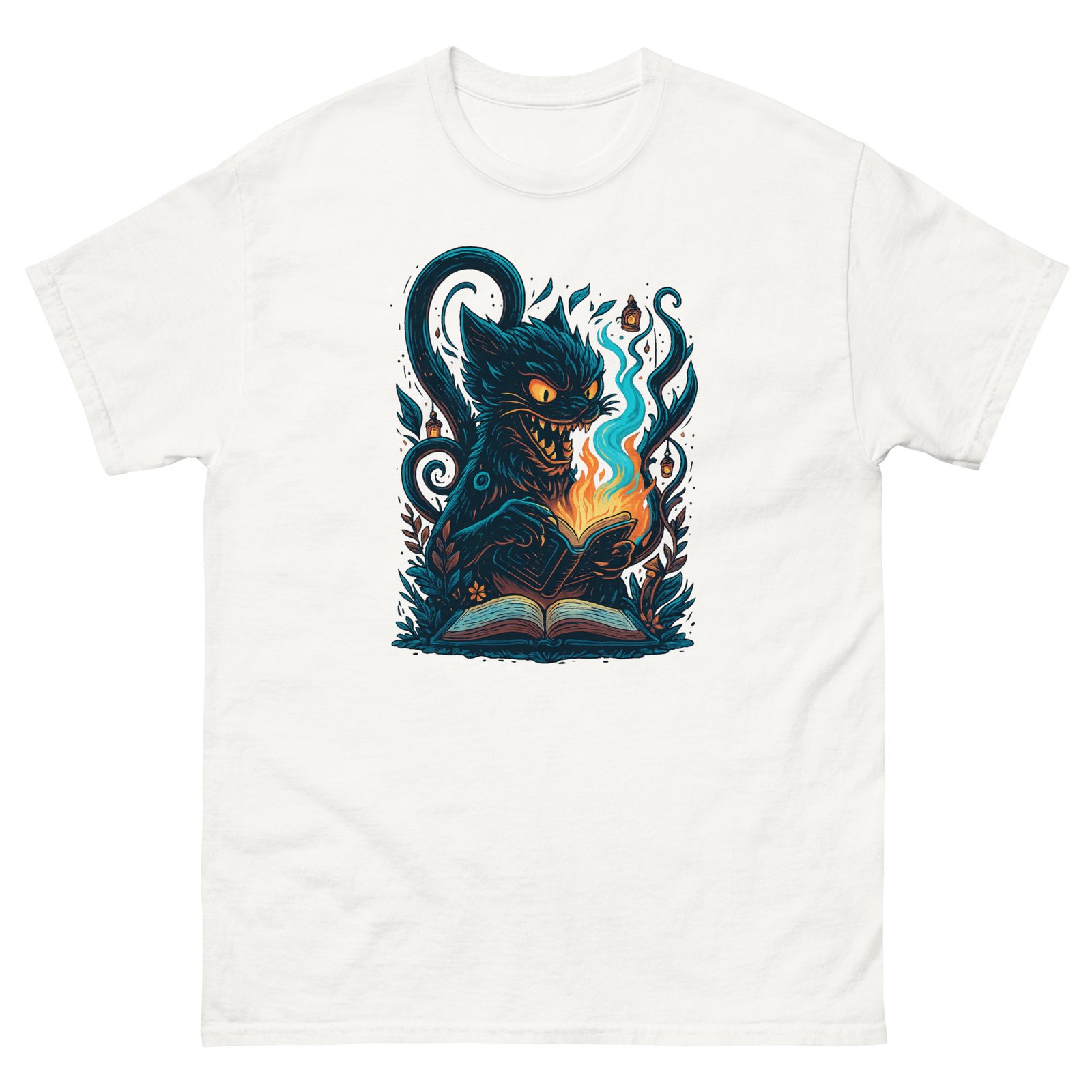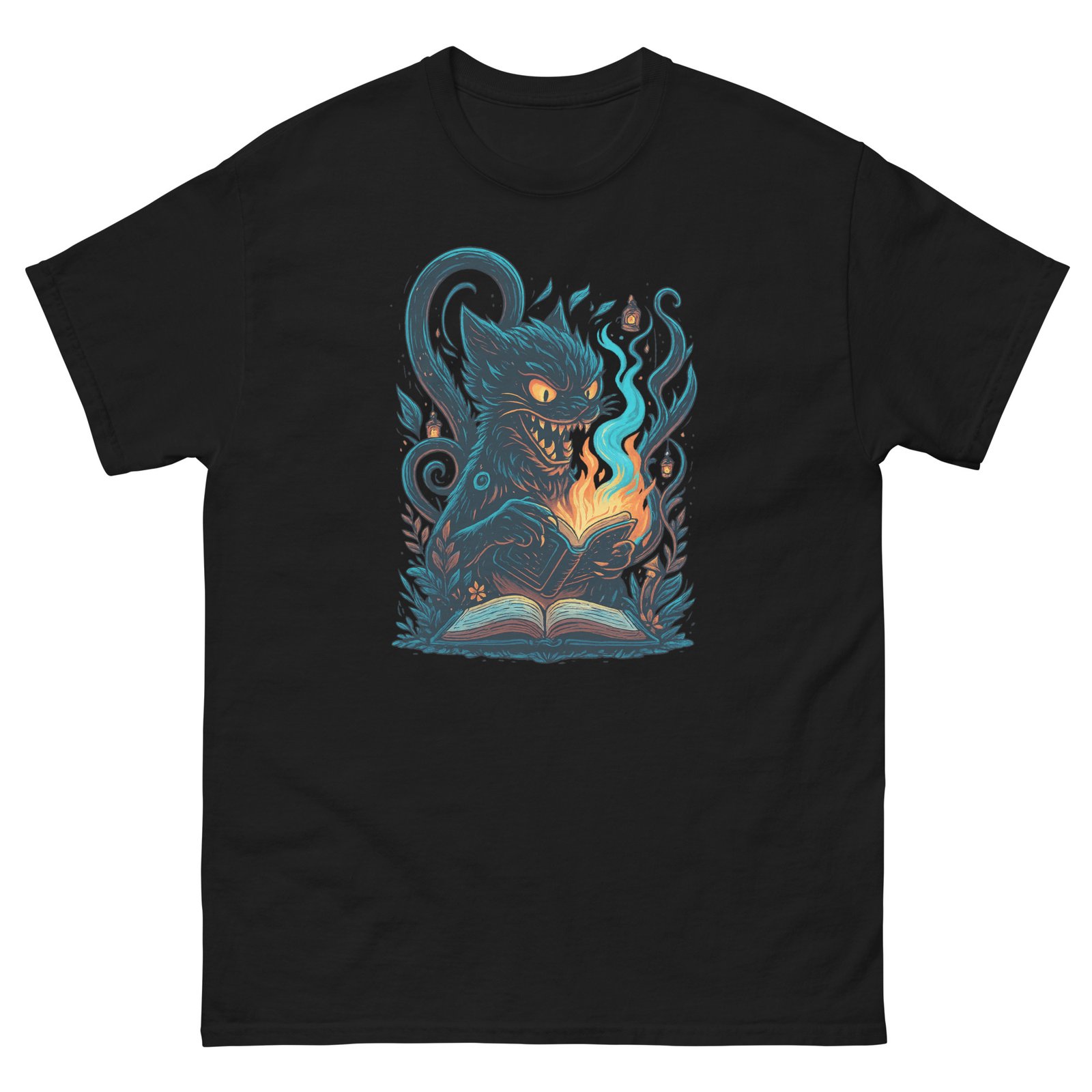 Mystical Cat Flame Art – Fantasy Cat Reading Spellbook Design – Unisex classic tee