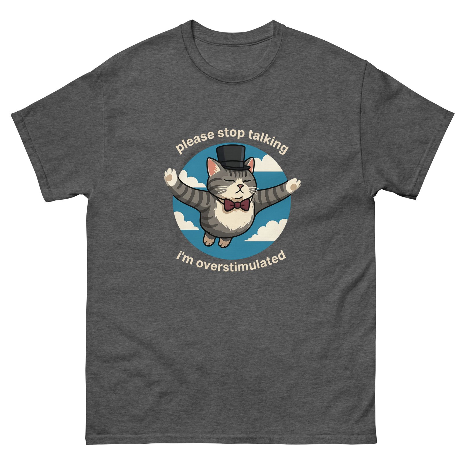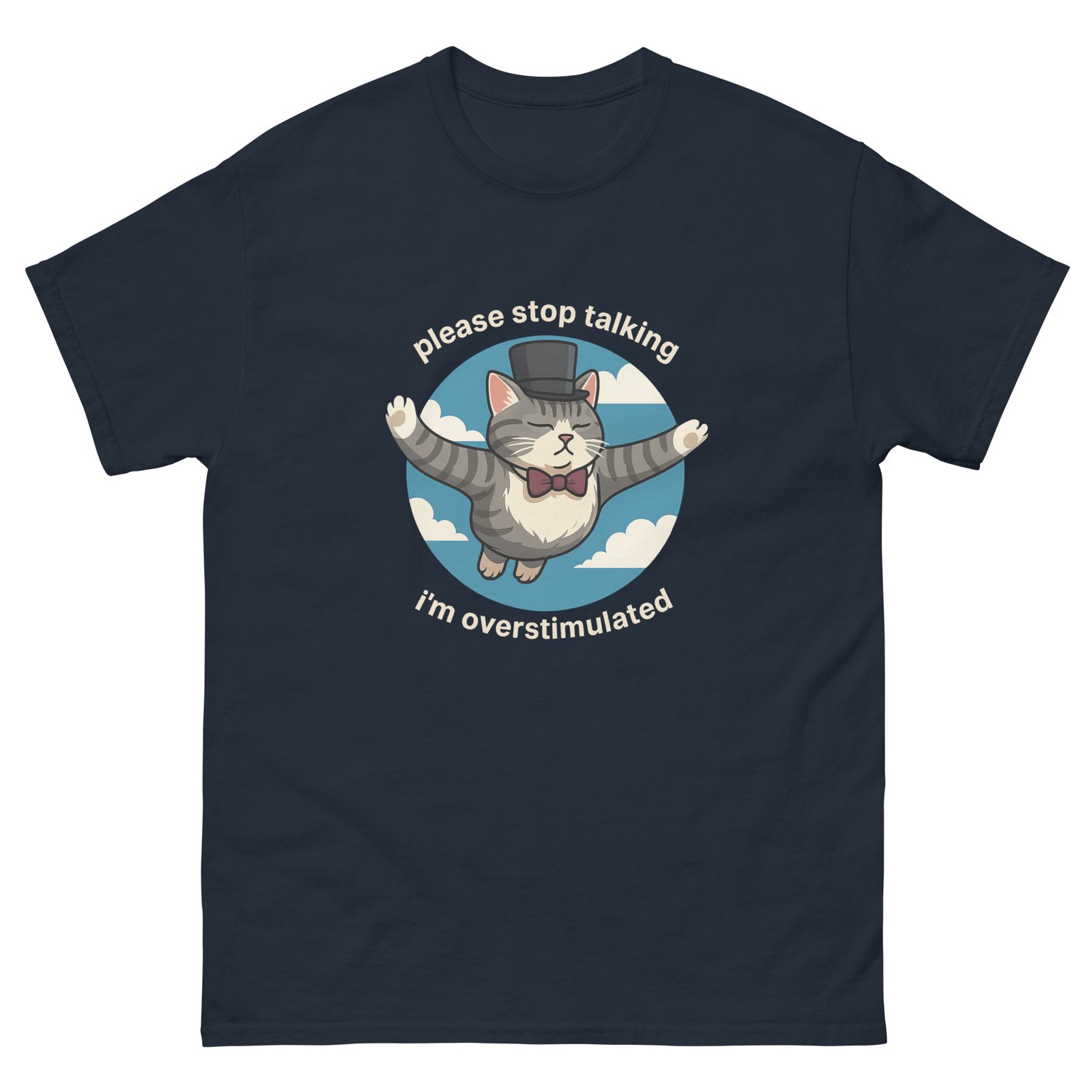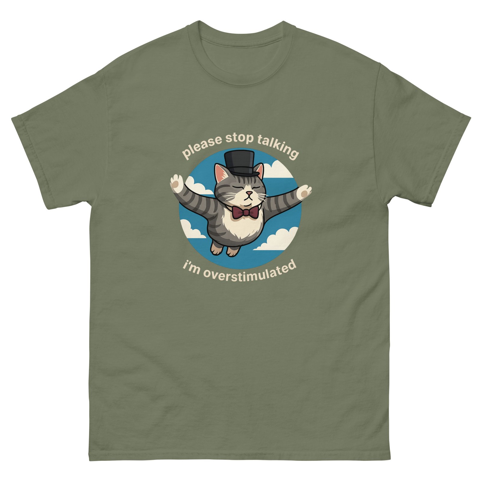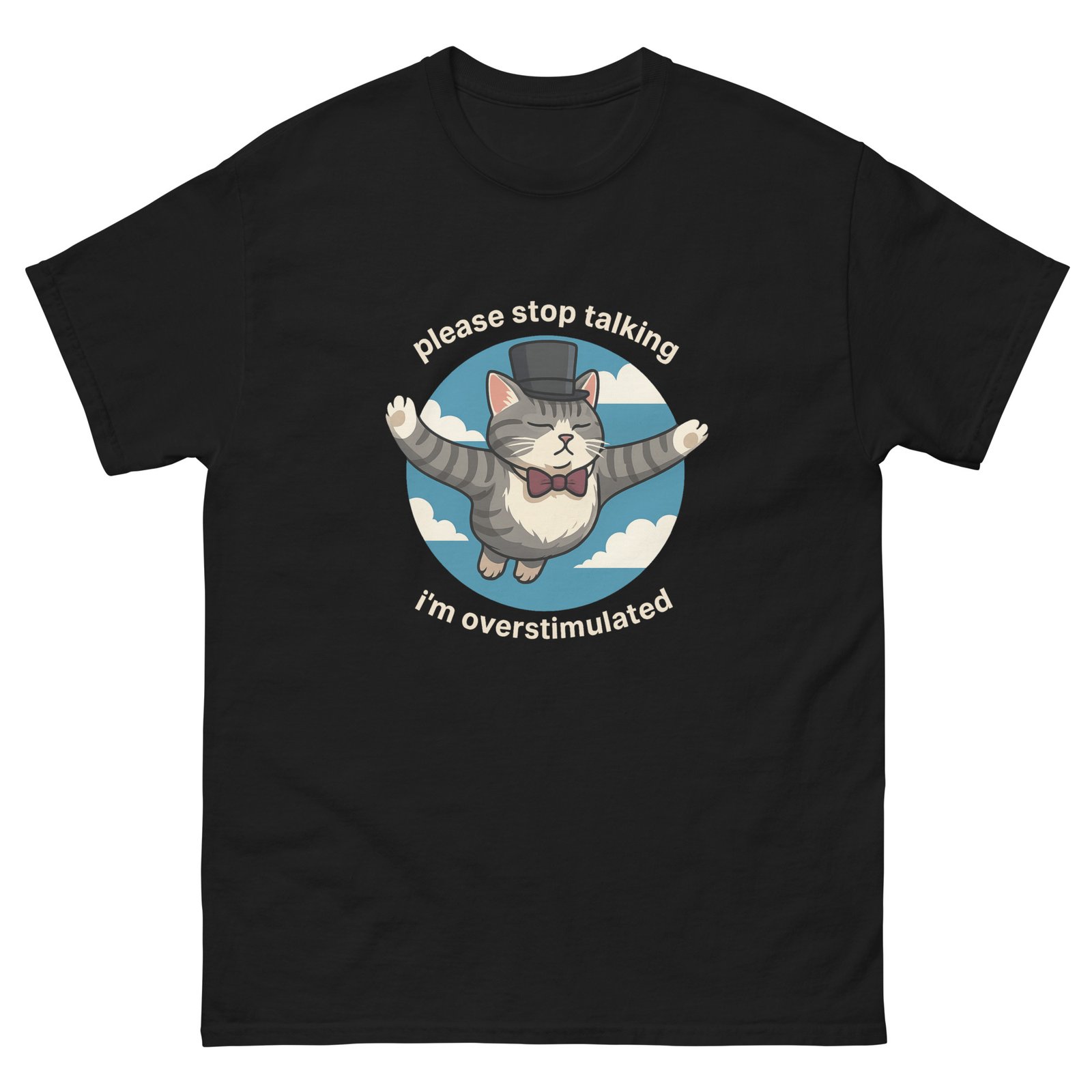 Overstimulated Introvert Cat – Please Stop Talking Top-Hat Kitty Anxiety Meme Tee – Unisex classic tee