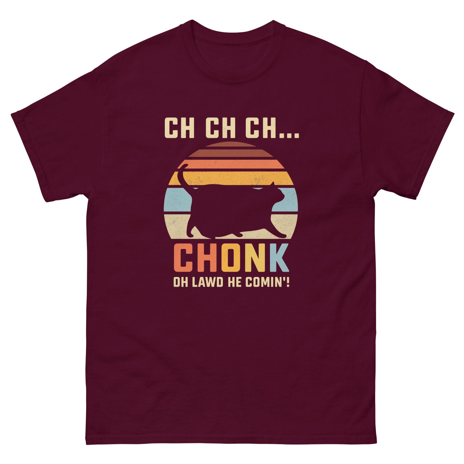 Chonk Cat Retro Sunset – Funny Oh Lawd He Comin’ Cat Lover Tee – Unisex classic tee