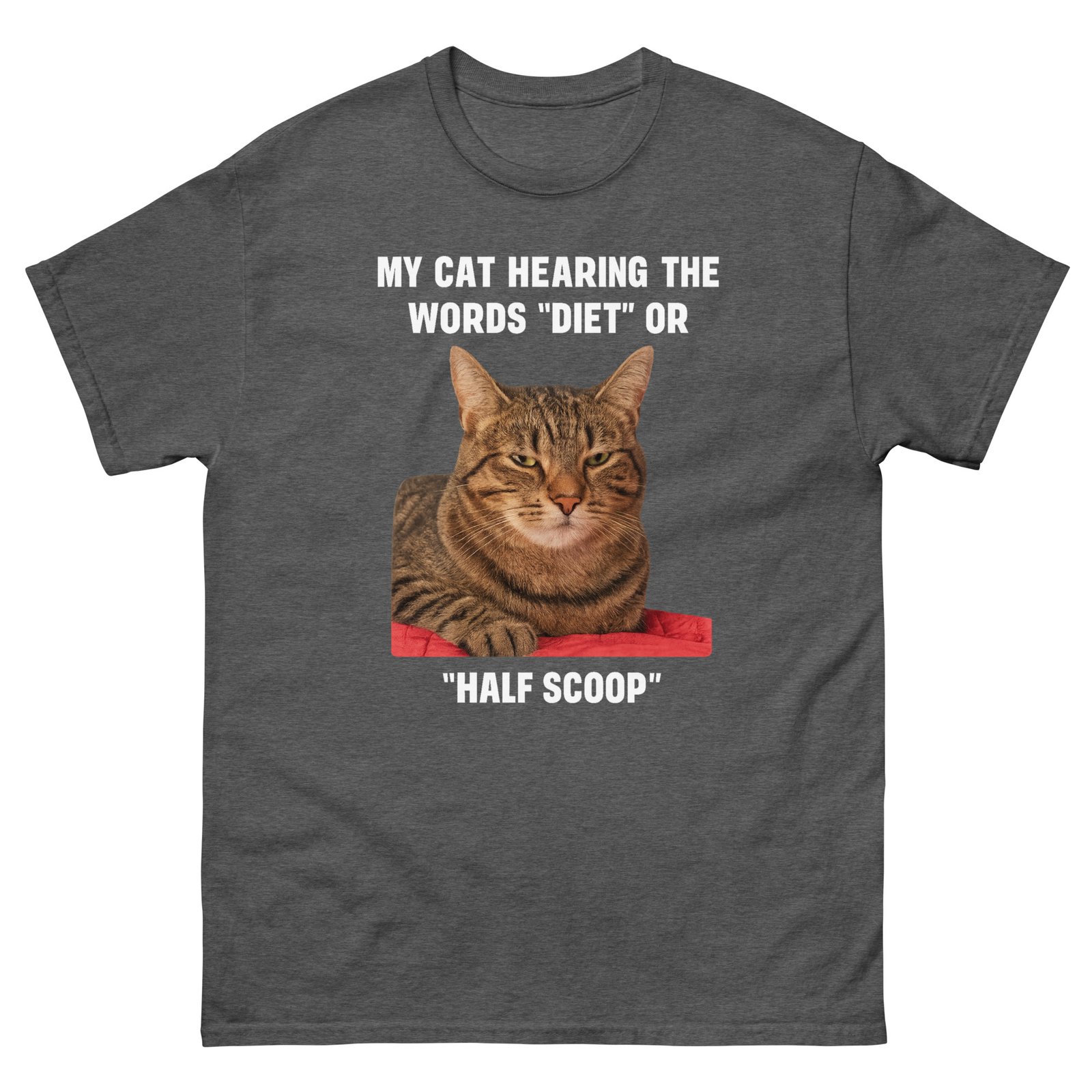 My Cat Hearing the Words Diet or Half Scoop – Hilarious Fat Cat Meme T-Shirt – Unisex classic tee