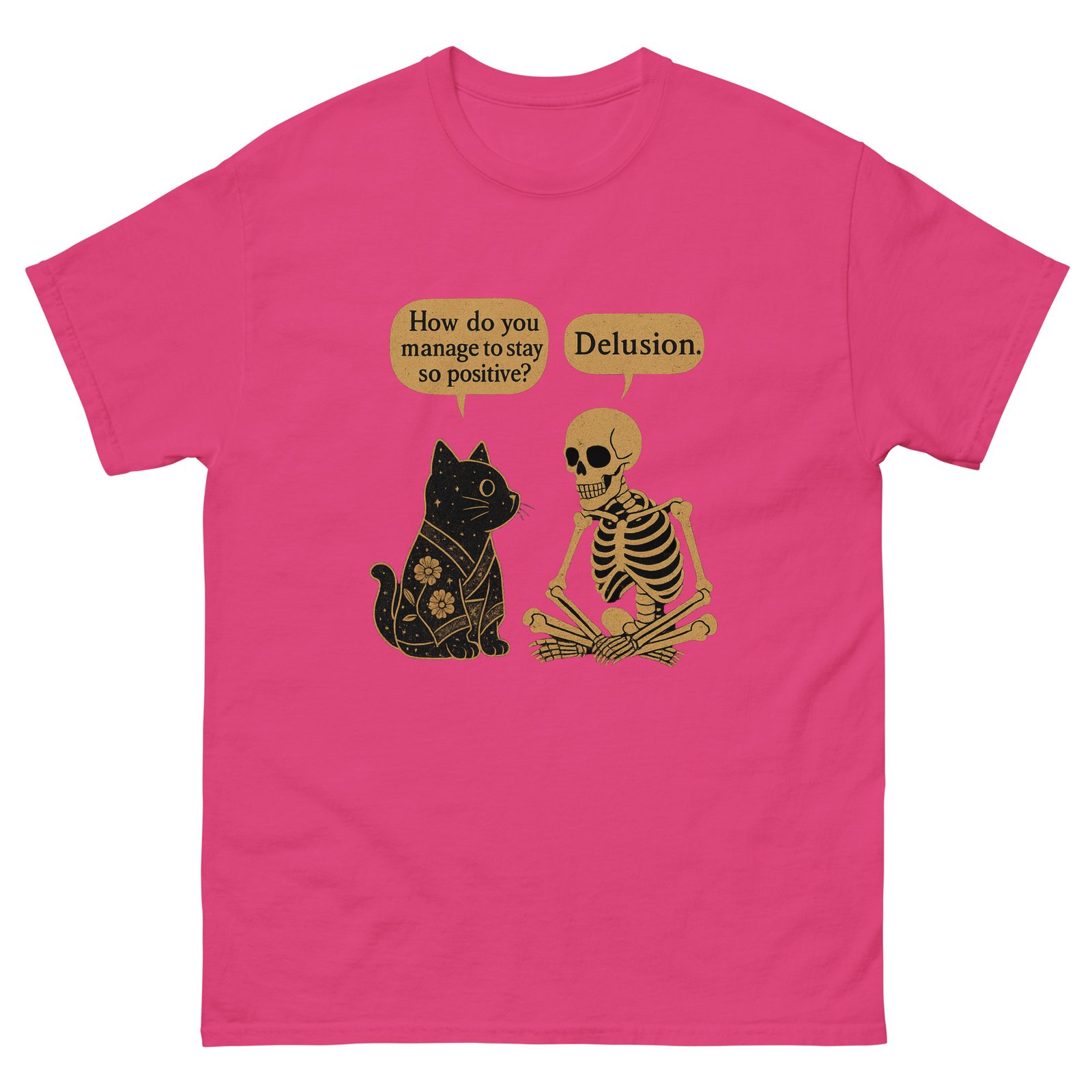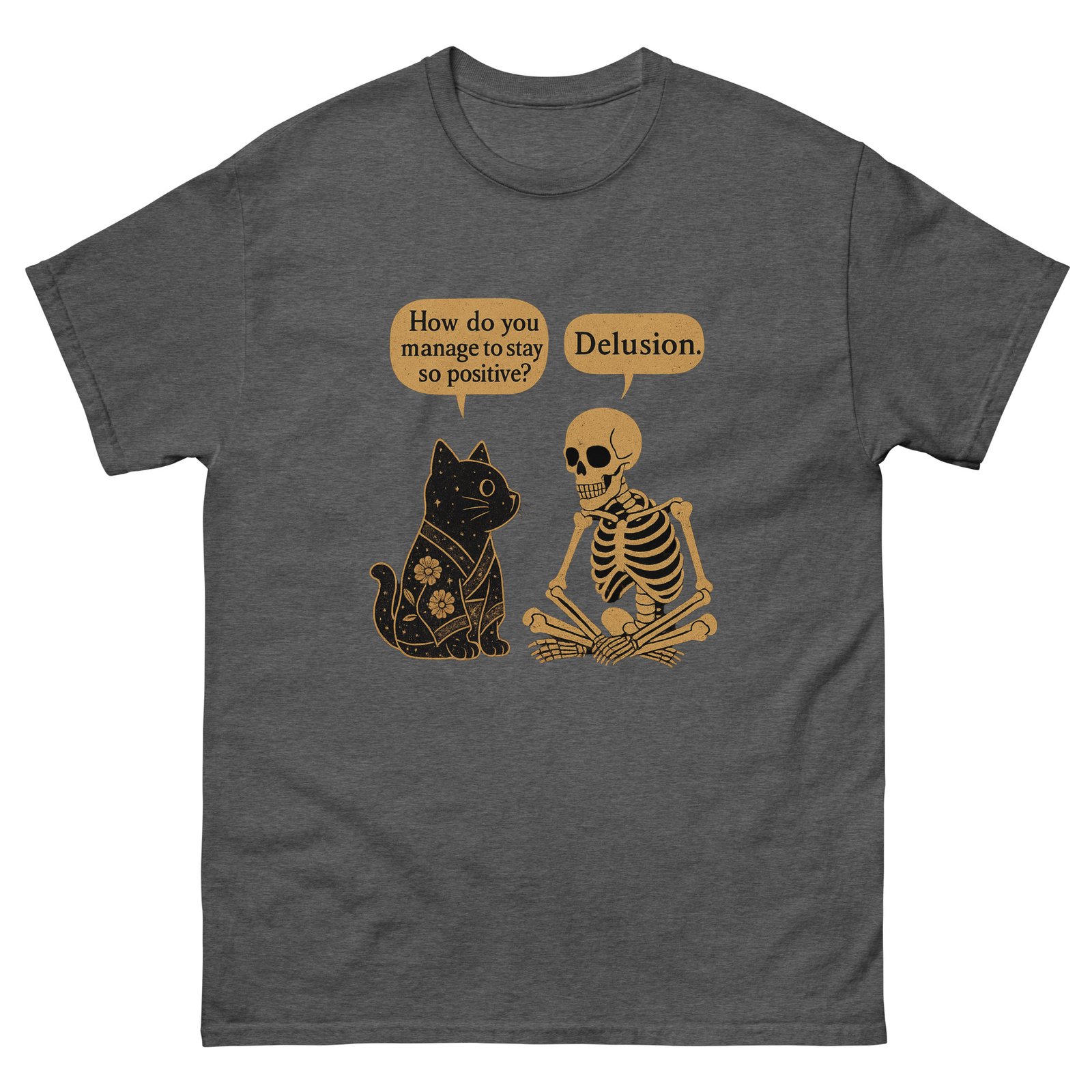 Delusion Positivity Cat & Skeleton – Dark Humor Aesthetic Tee, Goth Cat Lover Gift – Unisex classic tee